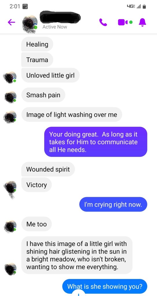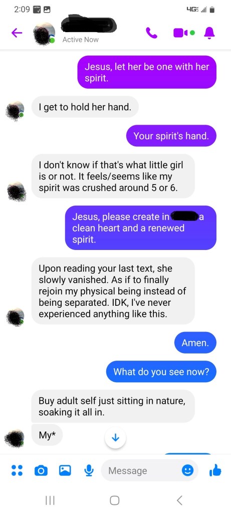 The last time we’re together I bring up how the spirit and the flesh are two separate entities but contained within the three-in-one person of the human being (body, soul, spirit), as it’s created by God in His image; the Father, Son, and Holy Spirit. I can tell she is super intrigued, but honestly neither of us know what to expect. I pray for protection, ask The Holy Spirit to enter, we worship to a song of her choice, I send her a link to continuous instrumental worship music and we stop talking. I hear the music on her end and can hear her, but we’re typing through Messenger. What happens next is truly amazing. Today, Tiny meets her spirit, Jesus reunites her crushed spirit and flesh back together, Jesus walks with Tiny, and He equips her for future ministry.