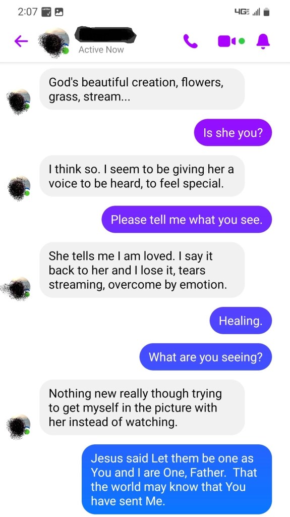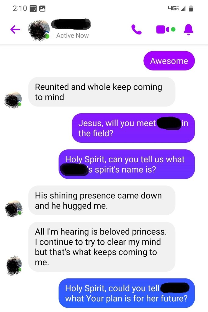 Her spirit and flesh are reunited and I feel I should ask Jesus if He can come be with her, in the field. I ask the Holy Spirit and He tells us her spirit’s name is Beloved Princess.