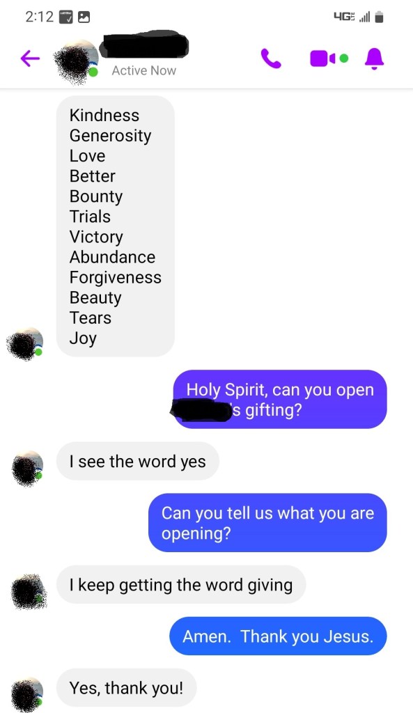 At first, The Holy Spirit doesn’t speak to her and I’m thinking, “Oh no.” Suddenly, He tells me, “I gave them to her [before you speak on the phone today].” I revert back to her original list and start from there, eager to see where this list will take us.