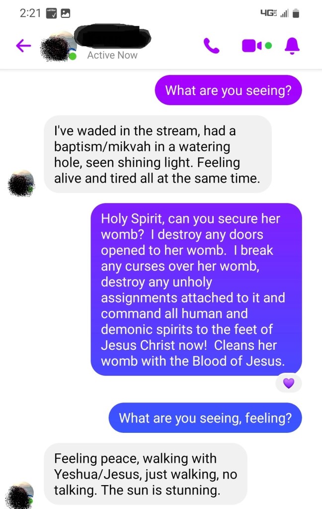 In the past, Tiny has had female problems and I am nudged to pray over her womb here. I do, He restores her female parts and she’s walking with Him in that place. Wow!