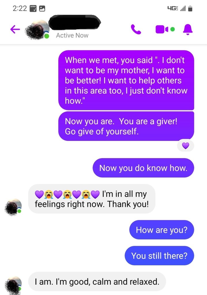 When we get on the phone, it’s like we’re old friends. We’re talking about many topics and issues, all pertaining to the work we’re doing together. I ask, “What were your thoughts when I asked about me introducing you to your own spirit? She answers, “Foreign,” but continues to tell me how she’s starting to see my question come to life in the scriptures she’s reading her children.