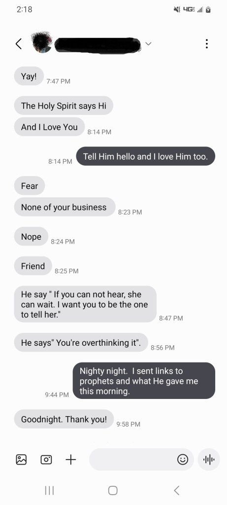 Bright has an unholy affinity with her phone…for a long time now. We discuss this issue and I tell her to repent for making the phone and Idol. She does and I break the Curse of the Cell Phone. “Twitch. You leaving?” I ask. “No!” he answers. I ask “Why?” and he retorts, “I’m cozy.” I cut off his head while he tries putting her to sleep so we can’t deal with him. “Holy Spirit,” I ask, “are you still with us?” We hear, “Yes.” “What do we do?” I ask. He tells us “Pray.”