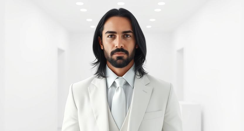 Suddenly another “man” appears. This man’s a little shorter than me. His skin is brown, his hair straight and black, and his eyes are brown. He looks as if he’s of Middle-Eastern descent. He has a mid-length beard and mustache the same color as his hair. He’s dressed in all white: white suit, shirt, suit vest, tie, socks and dress shoes…everything white, which also makes his skin, hair, and eyes really pop-off. He’s clean and very impressive to look at.