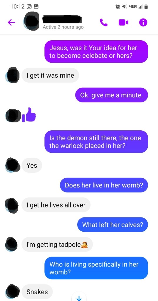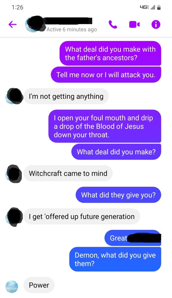 I mute my cell phone and begin typing my messages through FB Messenger. The demon is responding through this method, so we continue. I beat this demons face into the ground, he’s toying with me and making me mad. He claims to be “Human,” thinking I’ll let up on him, but I know he’s a liar. I threaten him and he responds, “Demon.” I open his mouth and drip a drop of Jesus’ pure Blood down his throat. They hate the Blood of Jesus, so I weaponize it to set His people free. I insist on the deal he’s made with the ancestors and he responds, “Witchcraft.” Not only is he answering, but Afrika is hearing. This is very encouraging, for me, at least.