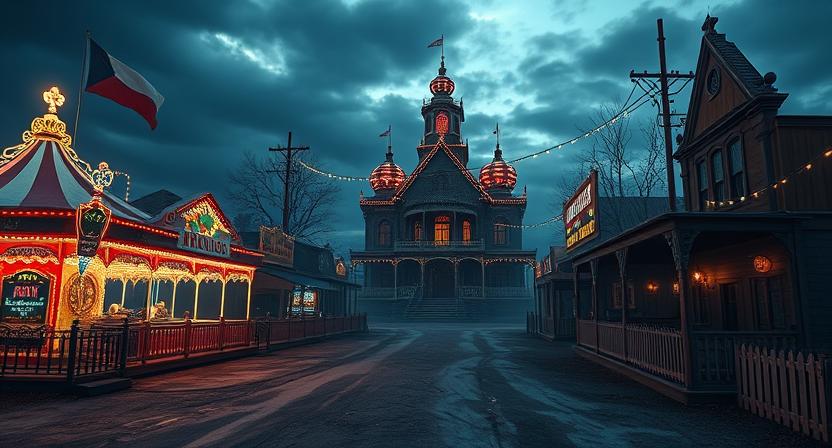 When the vision begins, I see Jesus in His robe, I’m walking at His right side and I’ve never been to a carnival like this before. The carnival is set up like an old western town, dirt streets with continuous, connected booths attached to one another on both sides. I see fairgoers and one carnie comes into view from the first booth. I look at him and he’s a big ugly demon. I grab onto Jesus’ robe, real tight, and Jesus & I keep walking as He’s pointing at a Ferris Wheel just behind the line of carnival games on our right. I see another demon. This one is torn-up, as if he got caught in a lawn mower or something. These demons are manning the games, as carnies would. This one’s short, whereas the other was big. Jesus pulls me as if to say, “Come on. Let’s keep going” and we cross the midway to the other side.