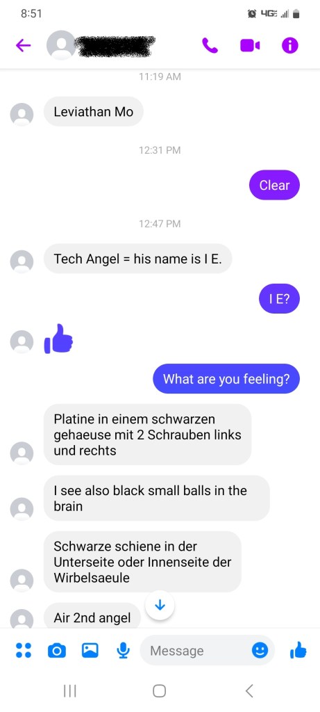 Clear is done so I ask the Holy Spirit what’s next. He tells me to release an angel assigned to remove ancient egg technologies. The angel’s name is “I E,” and I release him to do work. Frau tells me, “I feel [him] in my chest and heart. I feel he’s cutting things out” and she sees a black circuit board in a black housing with two screws and small metal poles and balls in her brain. I am super curious and ask Jesus, “Can I talk to the angel or should I go through You?” He tells me I can talk to the angel directly, so I ask a stupid question like a three-year-old, “So…you taking the poles out?” to which he simply replies, “Yes.”