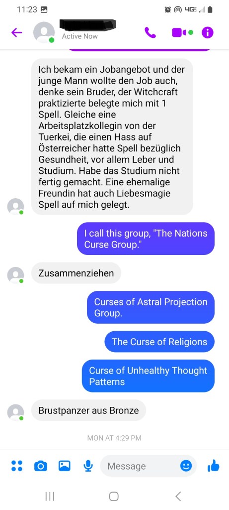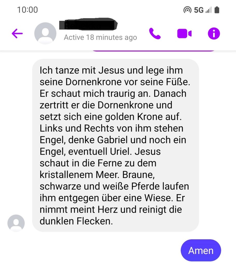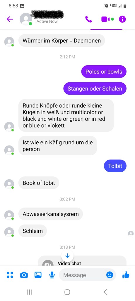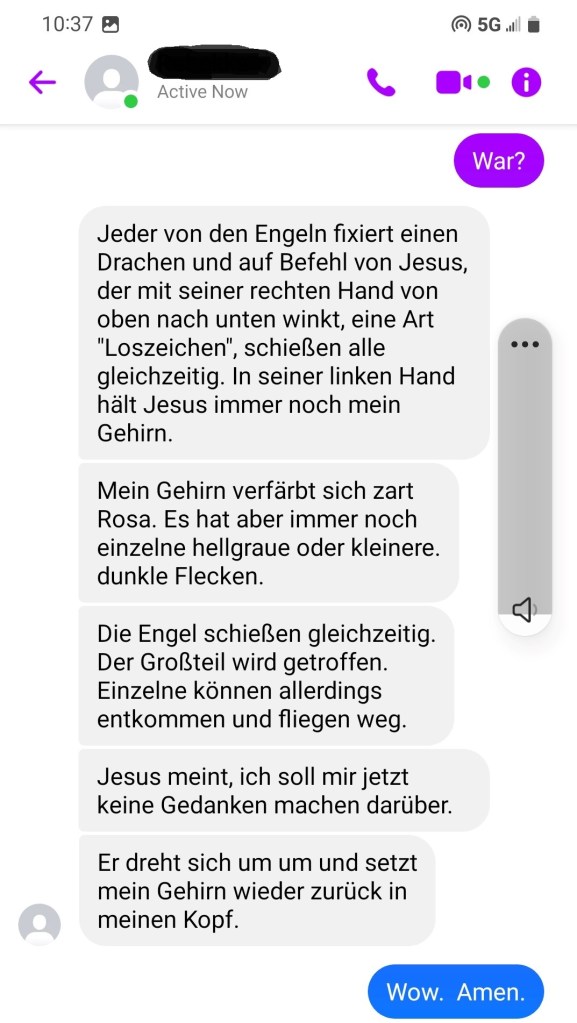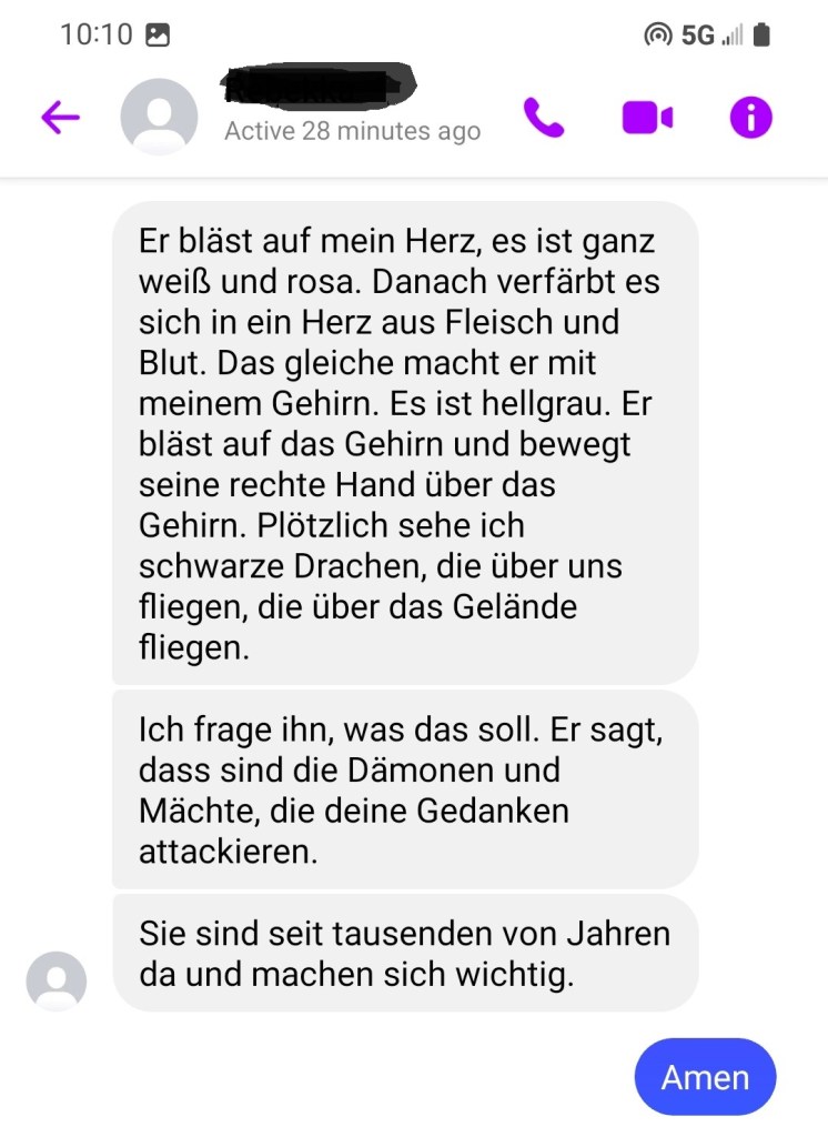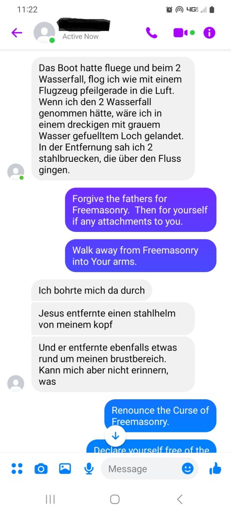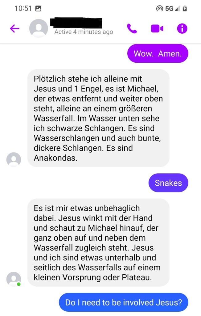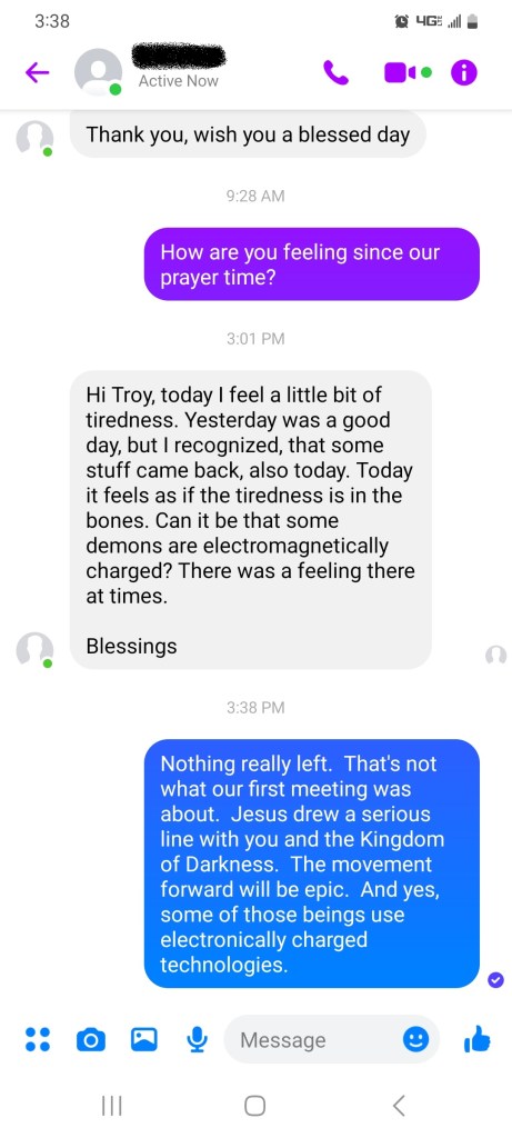 This is my first contact with Frau since Jesus takes her on a vision of Heaven. We’ve not got into any deliverance or healing. We will begin breaking the convoluted entanglement of the Kingdom of Darkness over her life the next time we speak. I am excited about what Jesus can and will do for her.