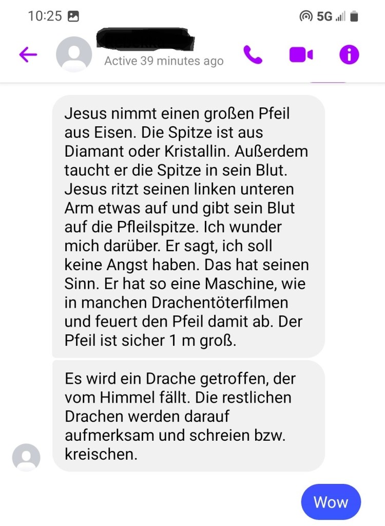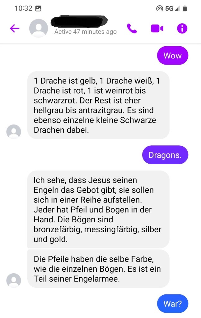 Frau asks Him for a deeper relationship, yields to His authority and immediately goes into a vision during worship. In this vision she dances with Jesus, we hit The Great Dragon Rebellion, and I destroy a dragon using information Jesus gives me from a book removed from our Biblical Canon. The following is her vision, translated from German to English: