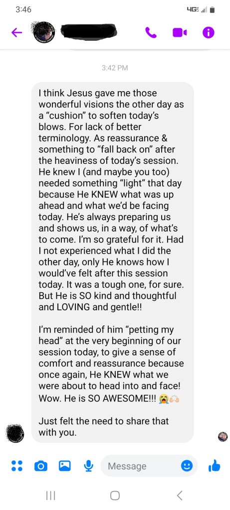 We pray, worship to a song of her choice and I begin calling out to see if Jesus is with us. He answers me and I ask Him “What do You have planned for Your daughter today?” He says, “Love.” I respond, “You are love” and He shakes her head up and down, “Yes.” He tells her, “Peace and compassion are tools” and her body assumes a position she doesn’t place it in. She tells me, “My knee is up, my arm is on my knee and my other arm is stroking my hair. Just like the last time. He’s stroking my hair [this time with her own body].”