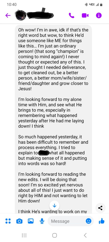 He’s stealing her breath; I call down the Breath of Life and a huge “slime ball” comes out of her mouth. “He’s Gone!” she says and we’re both crying as she repeatedly says to Jesus, “I’m sorry. I’m sorry.” She gets the word “Restoration,” I loose from Heaven gentleness and flexibility to the Word of Jesus which is the opposite of Stubbornness. She tells me she feels, “Woozy.” And tells me her mind is chilling out, but we both need some confirmation. We were talking to Jesus and in a second we’re talking to a demon. When did Jesus end and the demon begin? I begin to think, “How long has this been going on? A couple days? Months? Forever?” I need answers.