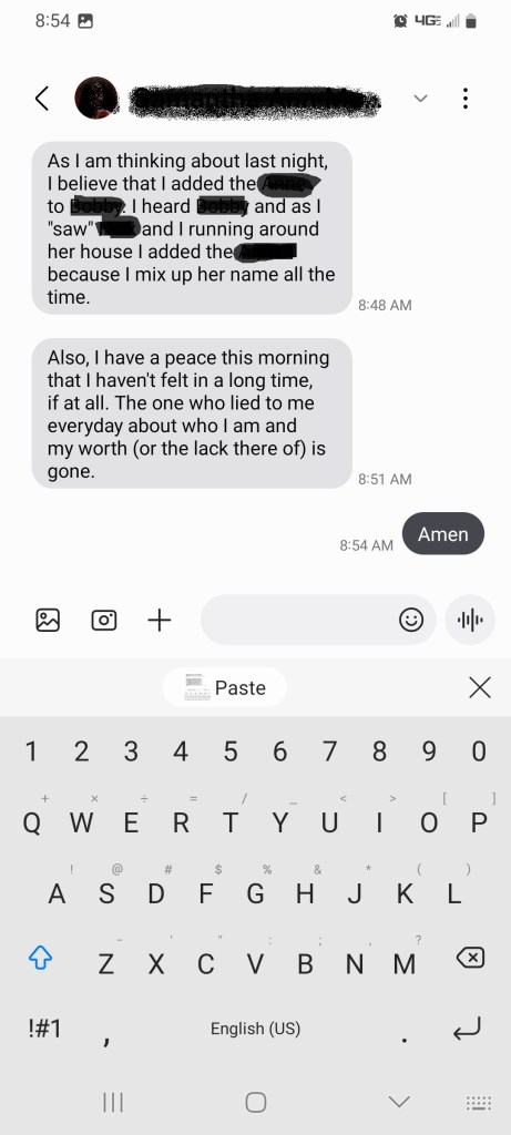 It’s been a while. We both know there’s work to be done, but schedules and families have suppressed our ability to get together for the purpose of The Work. Anthea has a death in the family and has to rescue one of her relatives from drug abuse. She’s a hero to most around her but denies herself deliverance and healing. Self admittedly, “Comparing between Mary and Martha, I’m the Martha.” We do the prayer work necessary for today, we worship to a song of her choice and invite Jesus in to have His way. I Test the Spirit, He’s here and we get to work. Jesus tells me to take her to her childhood. We travel over three Timelines, burn down a room of witchcraft and deal with one who’s holding her memories hostage.
