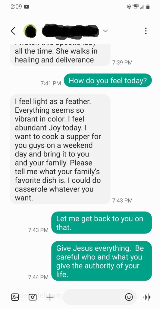 As it relates to your present theology about a Christian having a demon, I am not trying to argue with you or condemn you. I simply want you to look at your present position given the facts of this occurrence (and others like it on my site) and allow the Holy Spirit to reveal things to you – if not right away, over time. Deliverance is NOT for the unsaved. It is for the saved, to set the captives free. Thank you for hearing my position on an intimidating Christian topic.