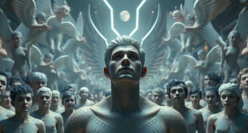 I turn to God, as if to say, “That was easy” and I see five angels hitting the ground beyond us. They hit the ground as superheroes do in the movies – one fist to the ground, one knee down, one knee up, and they all look up at me at the same time. That’s where Hollywood, Los Angeles, the City of [Fallen] Angels, gets this by the way. This is how they land. I command the leader of the group in front of me and put iron clasps on the mouths of the others. I ask, “Are you Fallen Angels, or are you on the side of My God.” The leader answers, “We are not on the side of your God.” I demand, “Then, state your business here.” The leader says, “You just sent our workers to Hell and took the children. We’re coming to defend what belongs to us.” I don’t think they can see The Father and, somehow, I know to say, “They’re not yours anymore. My Lord claims them. He told me to separate your subordinates from them and that’s what I did.” The Fallen Angel retorts, “And, who are you?” I respond what The Lord has trained me to respond, as it relates to my position with Him, “I am His White Bull and I’ve come to make all things right.” The angel and I are staring at each other, we’re both stern-faced and he begins looking around at the same time he’s looking straight at me. He’s doing both these things at the same time, as if he’s a couple different parts within the same being. He looks back at the others who’ve flown in with him as they’re looking at him, then he looks back at me.