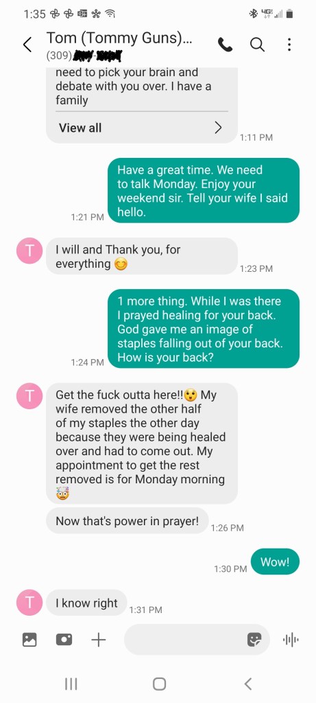 I then remembered that I prayed for his back and Jesus gave me an image in my head of his staples falling out onto the floor. I never told Tommy G this until today. His response floored me. He told me that his staples were scheduled to be removed this coming Monday, but he healed so quickly that his wife had to pull them out because his skin was healing over-top the staples. Amen? Here is a screenshot of that portion of the conversation: