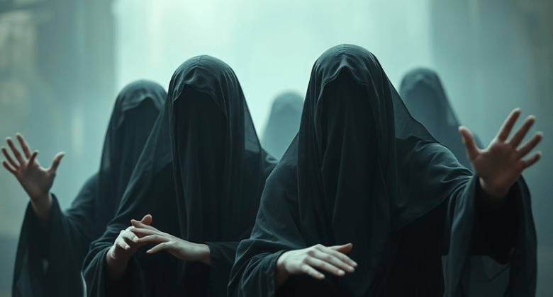 The witches take their position and stand motionless. I look back and Jesus and He’s watching another one enter the church building. I look at this one and see this one is veiled. I’m standing beside Jesus in the spirit, but my vision is also flying all around the Veiled Witch, three hundred and sixty degrees. I cannot see who the Veiled Witch is because the witch is fully covered from head to toe. Eerie looking. Unlike the other witches, the Veiled Witch walks straight up the center aisle toward the pulpit.
