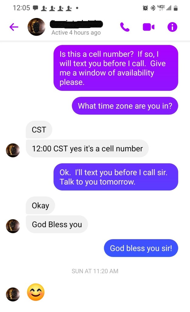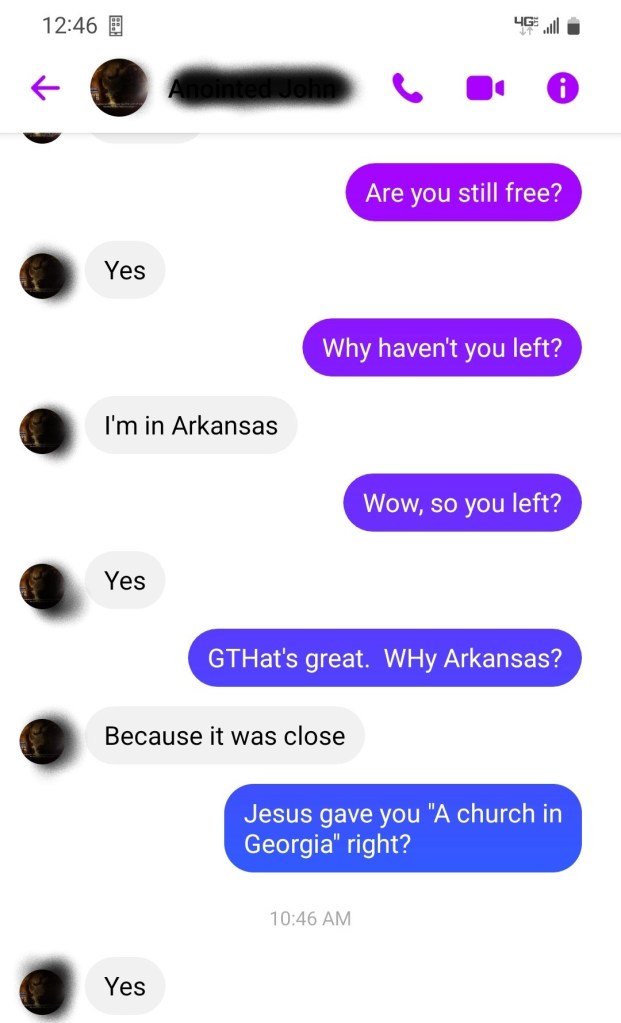 Today I speak to Yonatan. He assures me that he is still free and has left his witch girlfriend’s house in Mississippi. He has moved to Arkansas even though Jesus told him to go to a “church in Georgia.” I’m alarmed by an unannounced “group phone call” from him and another on Facebook. I didn’t answer. I will get to the bottom of this and why he didn’t go to Georgia when I speak to him next. I may have to help him financially, to be obedient. I will do what I have to to help position him for his calling in the Kingdom of God.